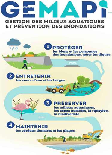 Créée par la Loi dite "MAPTAM" de Modernisation de l'Action Publique Territoriale et d'Affirmation des Métropoles du 27 janvier 2014 puis rendue obligatoire à compter du 1er janvier 2018 par la Loi dite "NOTRe" portant Nouvelle Organisation Territoriale de la République du 7 aout 2015, la compétence GEMAPI (GEstion des Milieux Aquatiques et Prévention des Inondations) est régie par les 4 alinéas suivants l'article L.211-7 du Code de l'Environnement :